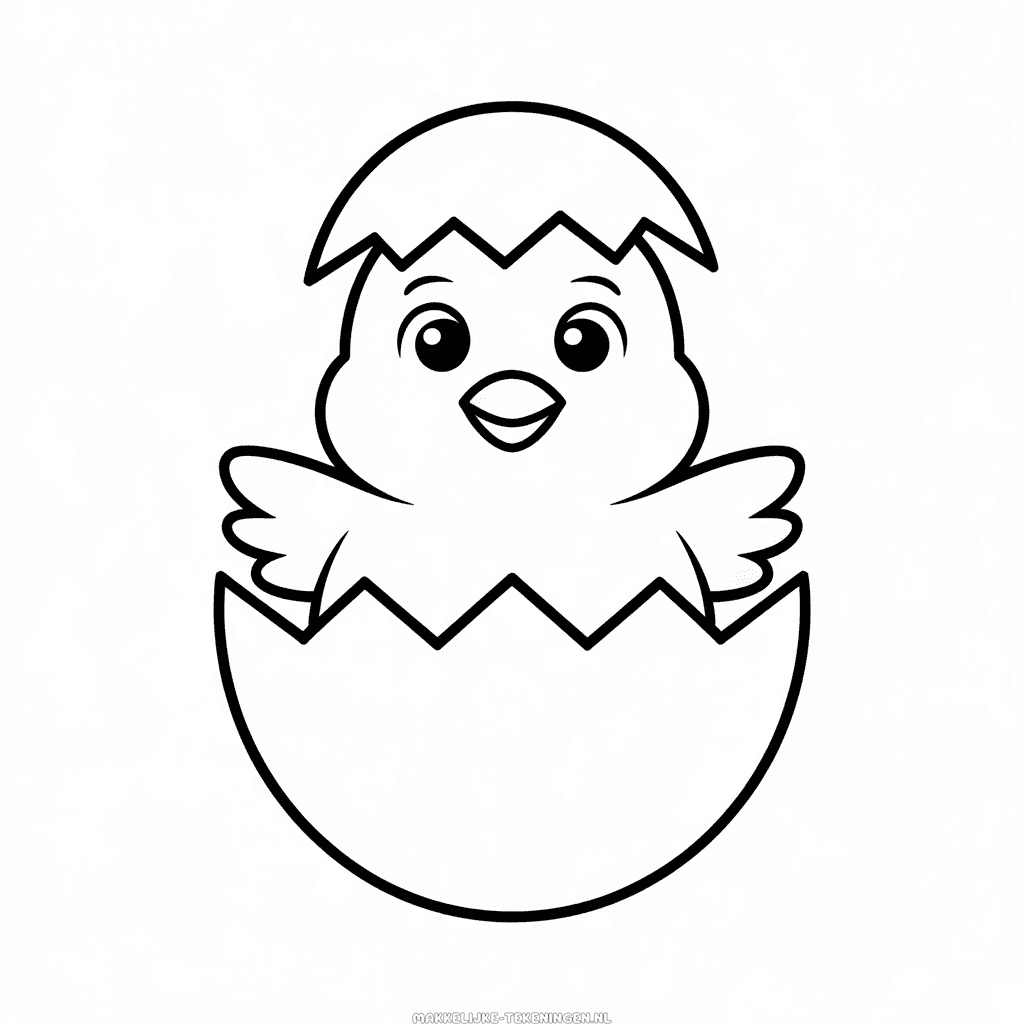 Eenvoudige tekening van Kip in uitkomend ei om gratis te printen, een schattige kuiken dat net uit zijn ei aan het komen is en klaar om ingekleurd te worden. Eenvoudig kleurplaatje om over te trekken of in te kleuren voor kinderen. Hoge kwaliteit sjabloon, perfect voor zwart-wit PDF-print in A4-formaat.
